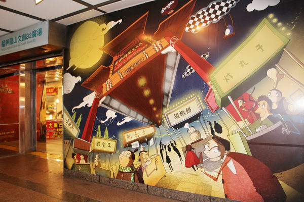 商店街を出ると、龍山寺近くの夜市の様子が描かれていた。