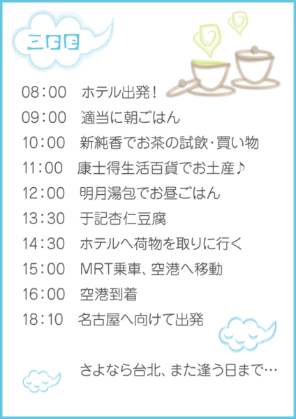 本日はいよいよ、7月に行く台湾旅行の計画表の最終日をアップ♬なのだ。