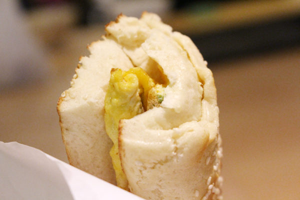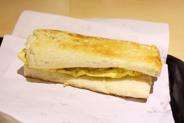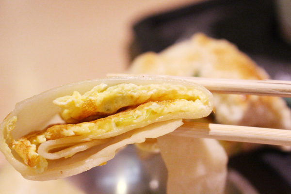 こんな感じで、モチモチ生地に玉子焼きが挟まっている。