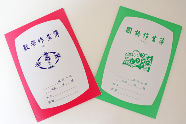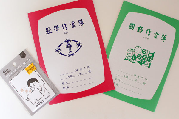 附箋型のスタンドメモに、台湾の小学生が使うとみられる学習用のノートだ。