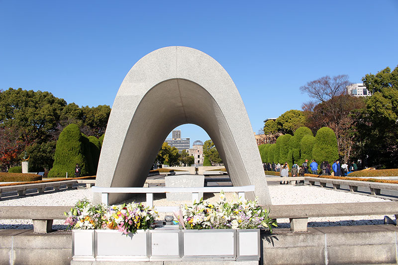 この原爆死没者慰霊碑からは、平和の灯と、原爆ドームが一直線に見える。