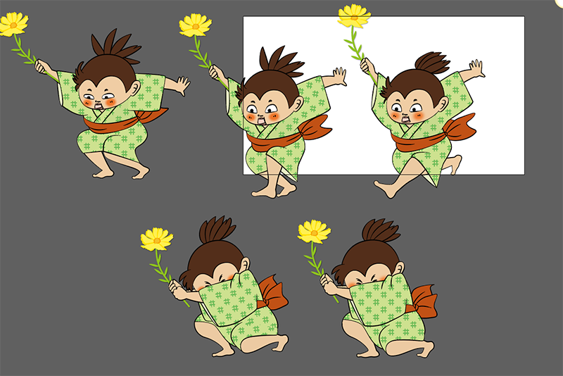 そして何より、イラレ上で基本の一体を描いておけば、あとはコピペで微調整するだけで動きに必要なカットが準備できるからだ。