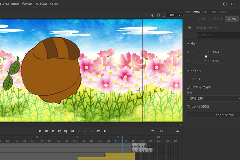アニメイトの機能であるモーショントゥイーンを使用して、この丸まったイラストを反時計回りに3回転させ軽快な動きをつけた。