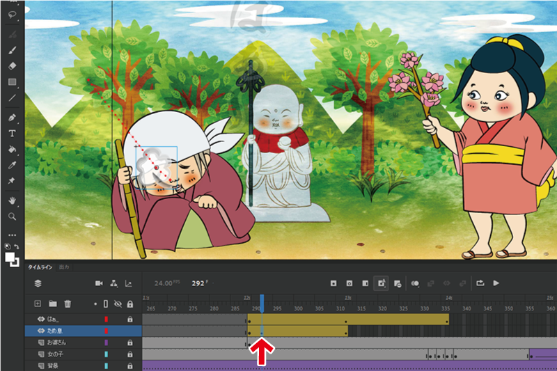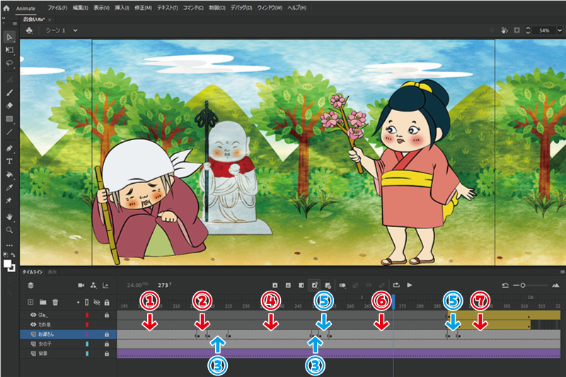 次に、このお婆さんをAdobe Animate(アニメイト)に配置して、実際に動きをつけていく。