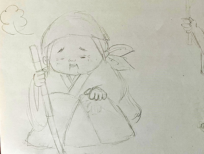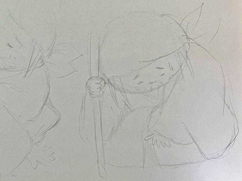 先ずは鉛筆の下描き準備するんだけど、お婆さんが座った状態(上の画像)と、立ち上がろうとしてガクッとなる様子(下の画像)の2つを描いた。