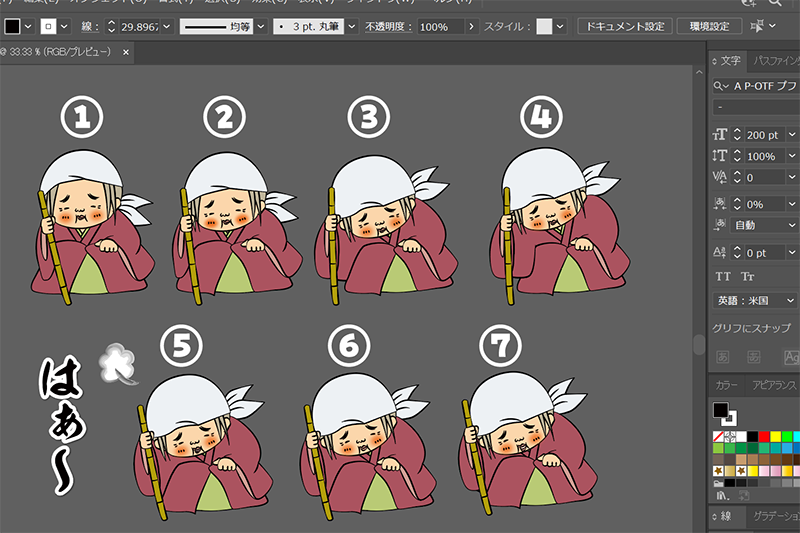 イラレで準備した①~⑦のお婆さんを、下の図のような順番で配置したよ。