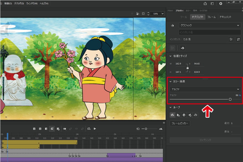 ため息を透明にするには、ため息の画像を選択した状態で、カラー効果の「アルファ」の数値を0%にする。