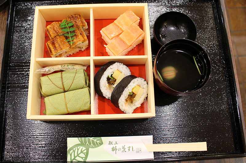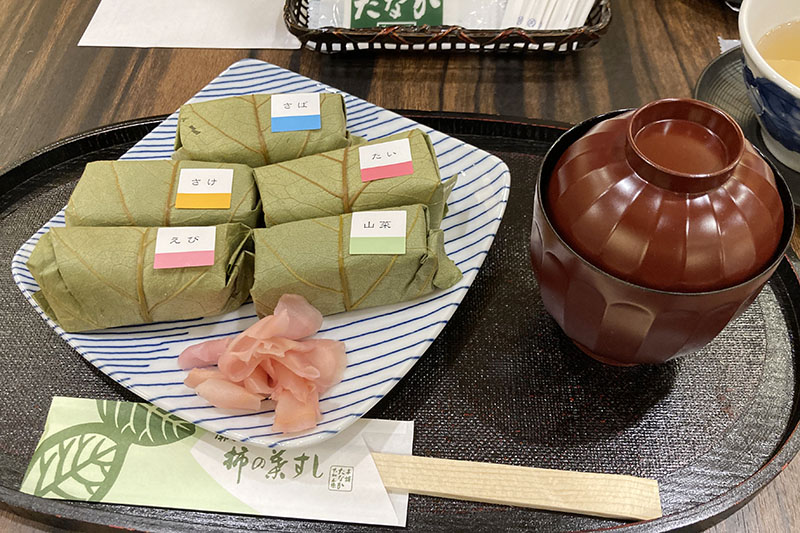 そして、こちらは5種類の柿の葉すしとお吸い物のセットメニュー。