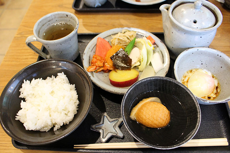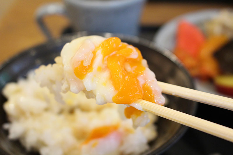 温泉卵と、お漬物があまりにもおいしそうだったから、まずは白米を食べることにしたよ。