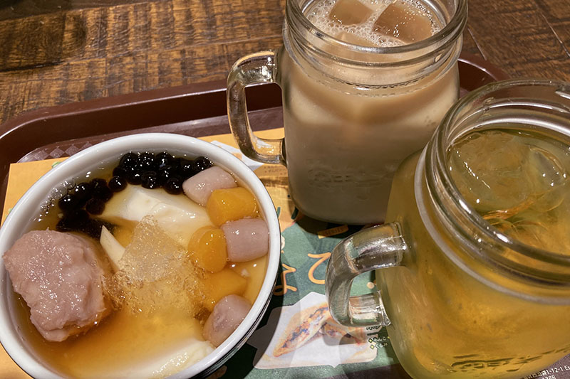台湾スイーツの代表ともいえる、豆花(ドウファ)と、金柑ウーロン茶に台ミルクティーを注文。