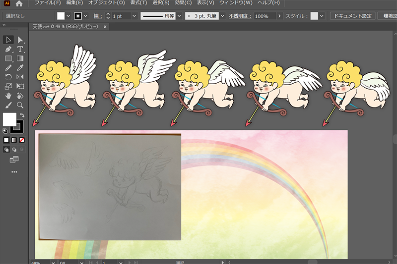 下描きをイラレに取り込んで、6パターンの羽をつけているキューピッドをイラレ上で清書したんだ。