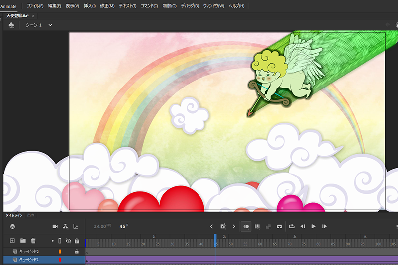 そして、このキューピッドのシンボルをクラシックトゥイーンという機能を使って、画面外から画面の中に移動させる動きをつけたんだ。