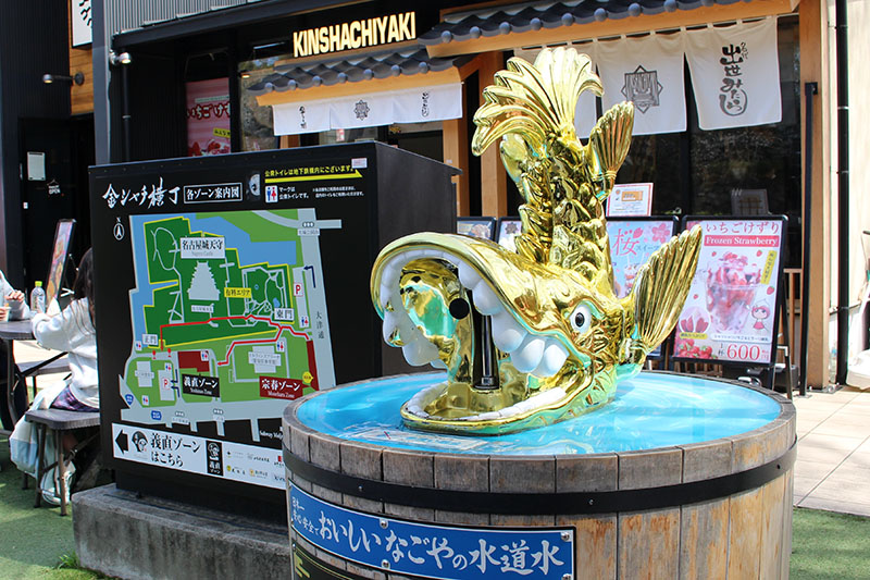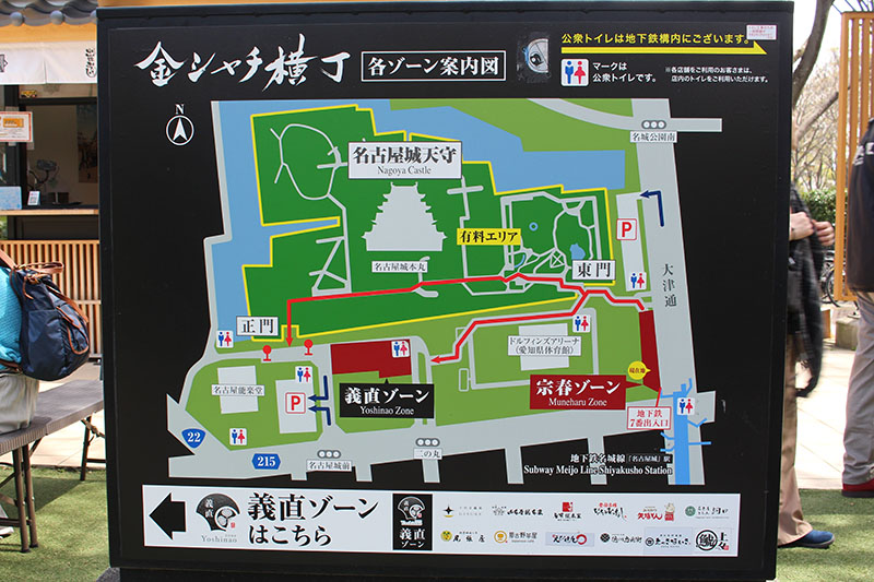 上のマップを見るとわかると思うんだけど、名古屋城のすぐ横に金シャチ横丁があるんだ。