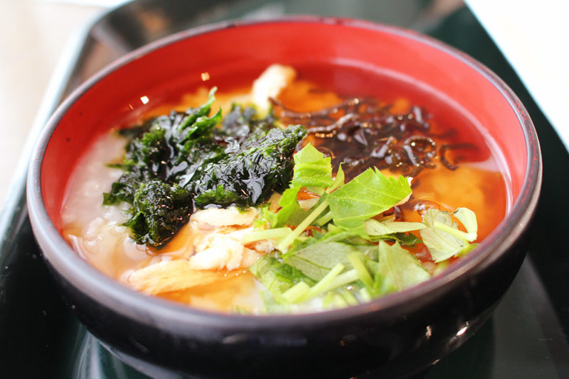 シンプルなお粥さんに、いろんな具材をトッピングして、出汁あんをかけていただくんだ。