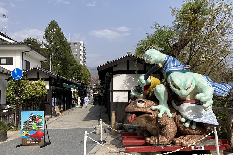 なんか、通りの入口から巨大なカエルや、カエルの顔出しパネルがあるインパクトの強い商店街だ。