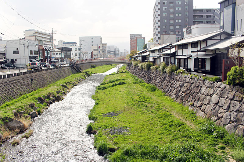 この、なわて通り沿いを流れる女鳥羽川(めとばがわ)には、かつて河鹿蛙(かじかがえる)っていう、美しい鳴き声のカエルがいたんだってさ。
