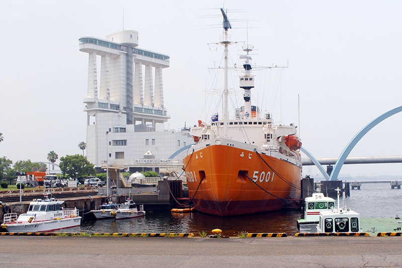 オレンジ色の巨大な船は「南極観測船ふじ」だ。