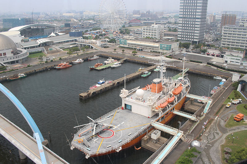 左上に見える青いプールがあるのが、名古屋港水族館。
