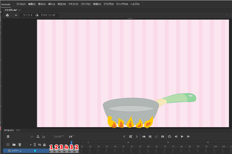 イラストは4つだけど、Adobe Animate(アニメイト)に配置した時に、4番目の炎の後に3番目のイラストを配置して、次に2番目の炎を配置して、繰り返しループする動きにした。