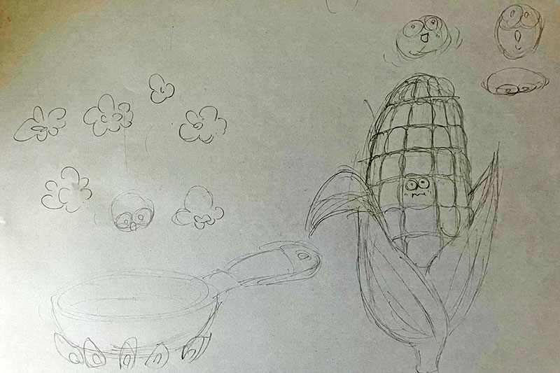 トウモロコシの粒がフライパンに落ちてきて、弾けてポップコーンに変化するアニメーションにするのに、5つの表情を描いた。