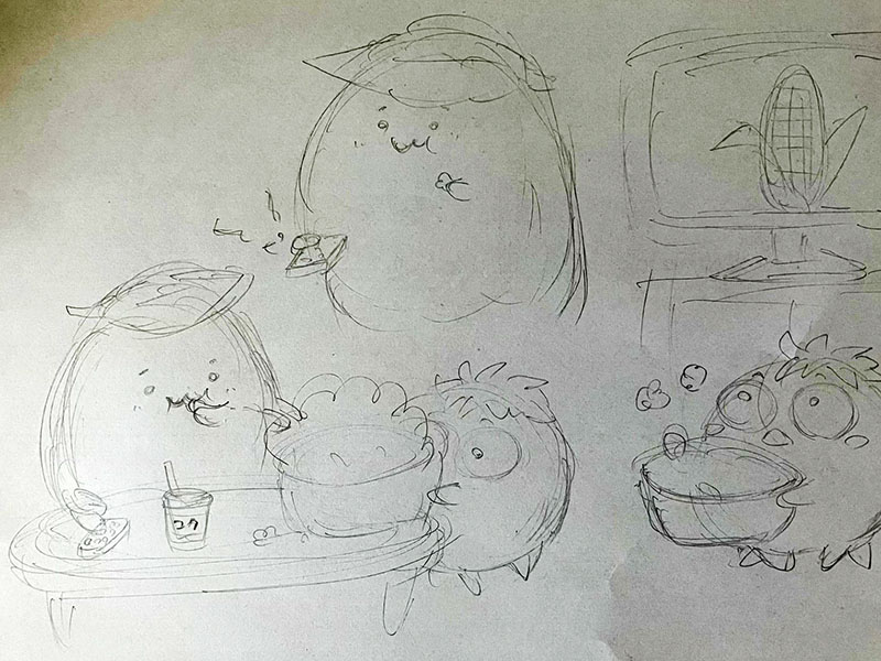 トウモロコシの粒は本来、丸みのあるプリッとした形だけど、平たく潰れたみたいな表情を加えることで、ぼよよんっと軽快に弾むような動きが表現できたと思う。