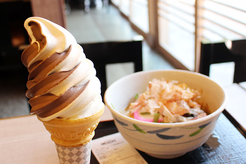 この時は非常に気温が高いお天気だったので、ミックスソフトと冷たいきしめんを注文。