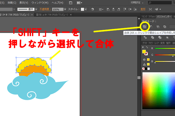 配置し終えたら、黄色の丸のみを選択して合体しちゃいます。