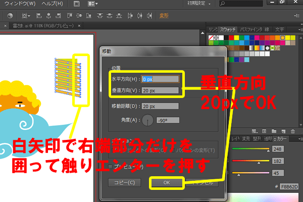 すると「移動」というボックスが登場するので、水平方向0px、垂直方向20pxを入力してOKします。