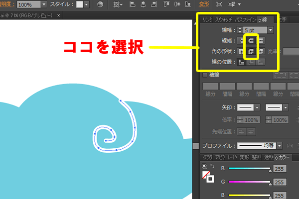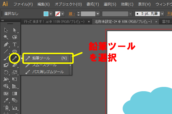 鉛筆ツールで適当に描きましたが、「線端」と「角の形状」は雲の白線を描いた時と同じにします。