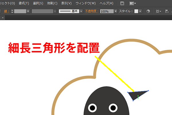顔のななめ右上辺りに、細長い三角形を描きます。