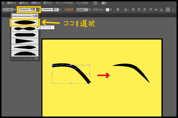 ペンツールで目のような線を適当で良いので描き、それを画面上部にある線の形状を選ぶところから 「線幅プロファイル1」 を選択。