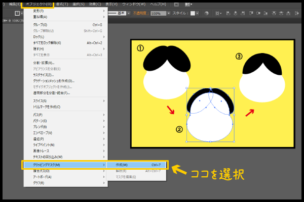 その②を選択した状態で、「オブジェクト」 → 「クリッピングマスク 」 → 「作成」 を選択。