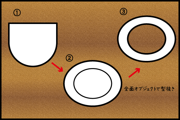 型抜きすると下図①のようなカップのボディ部分が出来上がる。