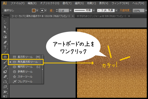 画面右端にあるメニューバーから 「角丸長方形ツール」 を選択し、アートボードの上をクリックする。