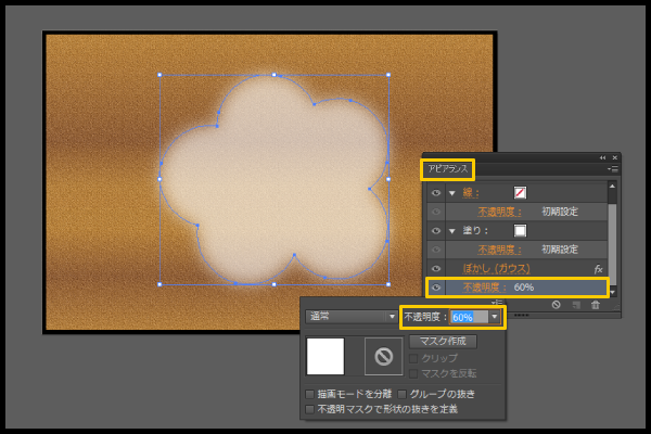 湯気を選択した状態で 「アピアランス」 から 「不透明」 を選択し 「60%」 と数値入力しよう。