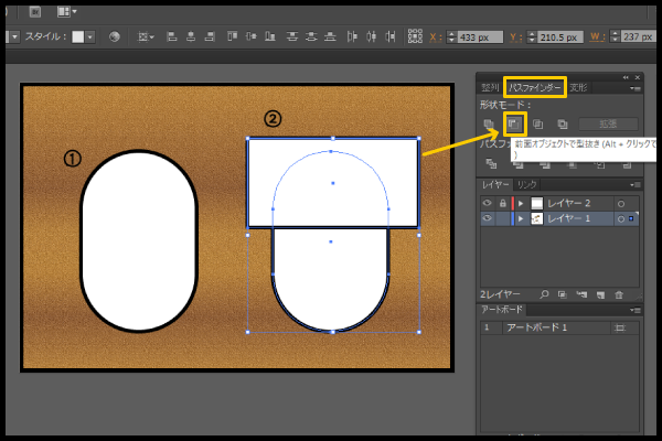 ②を参考に上の方に長方形を重ねて 「パスファインダー」 にある形状モードから 「全面オブジェクトで型抜き」 を選択。