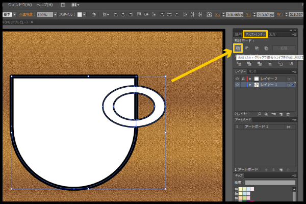カップのボディと持ち手を、大きさを調整しながら下図のように配置して 「パスファインダー」 にある形状モードから 「合体」 を選択。