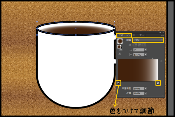 グラデーションは種類を 「円形」 にし。スライダー部分を選択してコーヒー色とカップの色をつけていく。
