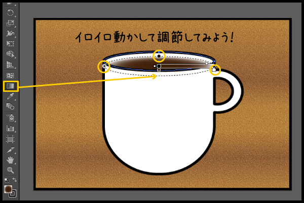 グラデーションの雰囲気を調整するのは慣れが必要なんだけど、左端にあるメニューバーのグラデーションツールを使ってコーヒーらしさを表現していこう。