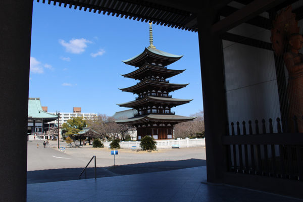 門の向こう側には五重の塔が見えるよ。