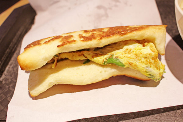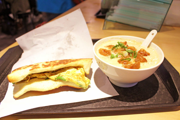 がりぼんは厚餅夾蛋(厚めの生地に玉子焼きがサンド)と鹹豆漿(塩味の豆乳スープ)を注文。