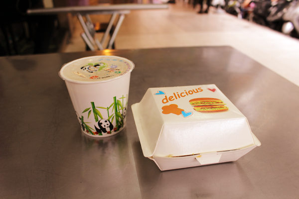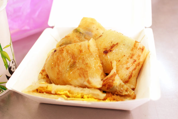 がりぼんが注文したのは、甘い豆乳の小サイズと、葱抓餅加蛋(中華風クレープに玉子トッピング)