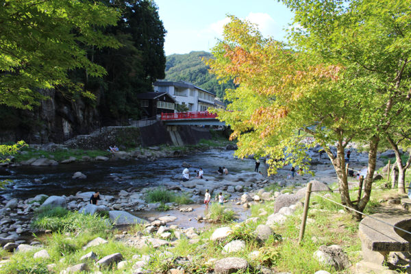 地元の美味しいソーセージやパンを食べた後は、紅葉で有名な香嵐渓の河原へとやって来た。