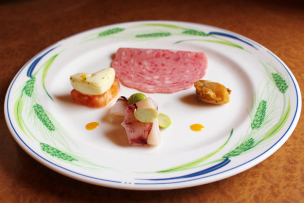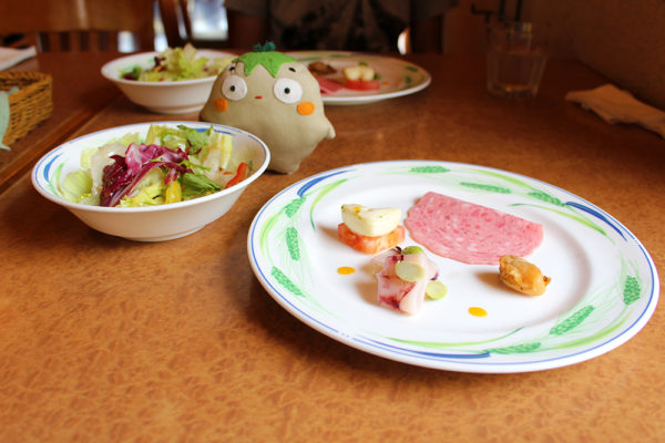 がりぼんは一番お値打ちなAコースってのにしたんだけど、最初にサラダと前菜が出てきたね。